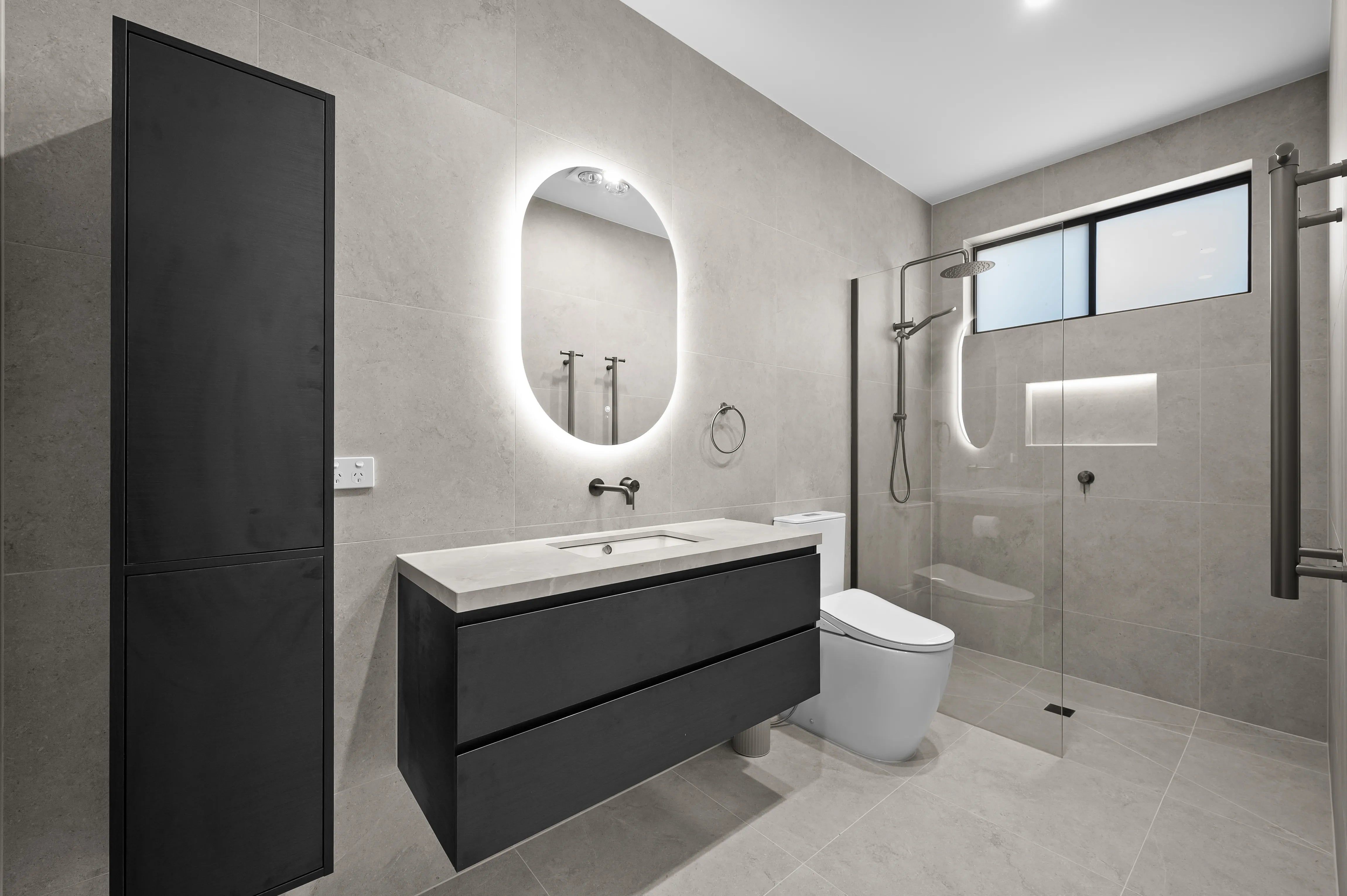 Warmth in a minimal modern bathroom comes from material choice rather than decoration. A timber-look vanity finish, a warm stone-look tile in an off-white or sandy tone, matt surfaces that absorb light softly rather than reflecting it harshly, and well-considered lighting all contribute to a bathroom that feels genuinely welcoming and human despite its simplicity. APD Design specialises in finding the precise balance between minimalism and warmth for each individual client and each individual space.